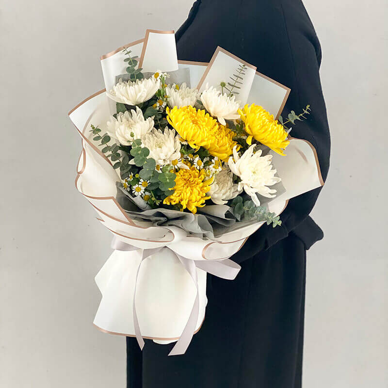 花材:白色菊花,黄色菊花,,其它绿叶搭配
