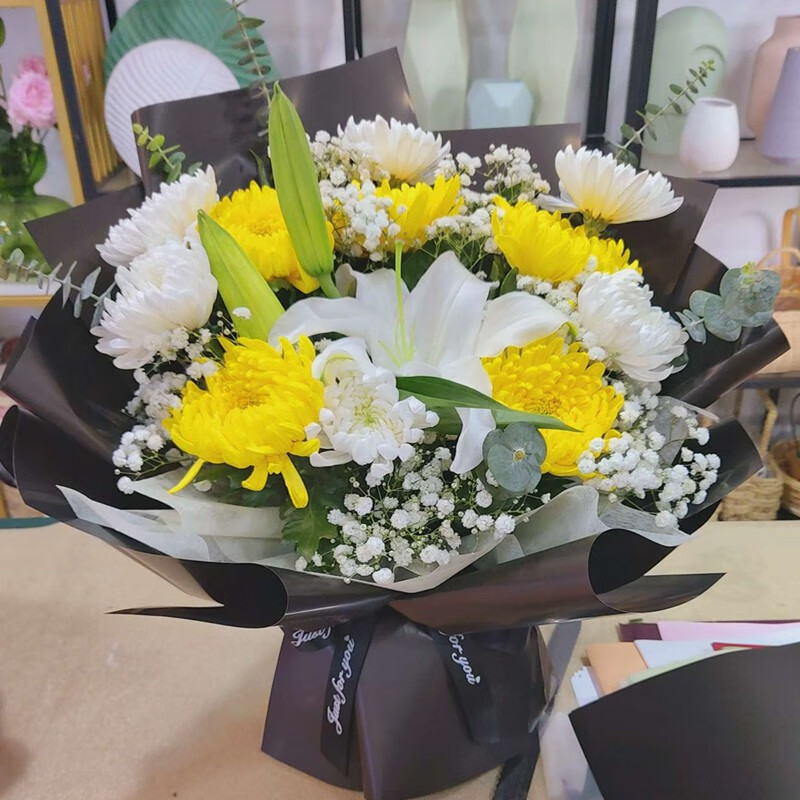 花材:白色菊花,黄色菊花,白色百合,其它绿叶搭配